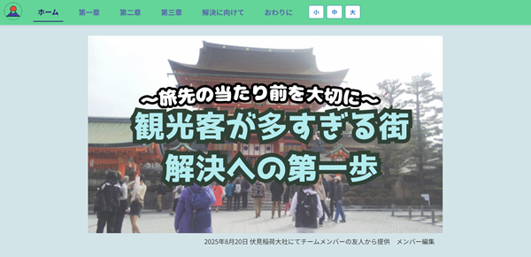 【講評】観光問題の中でもオーバーツーリズムの影響に目を向け,中学生の視点でごみ問題や交通渋滞などについて分かりやすくまとめられています。また,実際に来日している外国人にインタビュー調査を実施することで視点を変えて問題点を考えることや,様々な自治体の抱えている問題点の把握と対策をメンバーで話し合いながら整理し,それらを分かりやすく紹介する工夫も評価できます。