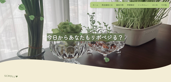 【講評】環境問題への関心が高まる中,近年注目されているバイオマスに焦点を当て,その有効活用やバイオマス発電の多様な方式について国際比較を交えながら紹介しています。「うどん丸ごと循環プロジェクト」のような身近な資源を活用した事例に加え,サイト作成グループ独自のプロジェクト提案も盛り込まれており,興味深い内容です。また視覚的に魅力的なサイトデザインと分かりやすい画像表現により,理解しやすい工夫がされています。