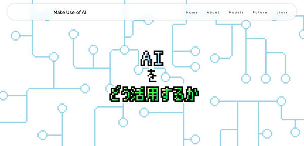 【講評】ストレートに学ぶべきテーマを打ち出したサイトです。AIモデル別比較の自己紹介ページはAI自身が自分を語るというアイディアがユニークでした。難しいAIを初心者に興味・関心を持たせやすくなっています。AIのことを学習したいと考えている初心者に役立つサイトと言えるでしょう。発信情報の元が企業の発信するWebサイトに頼りがちな傾向にありますので,幅広く情報元を検討するとよいでしょう。